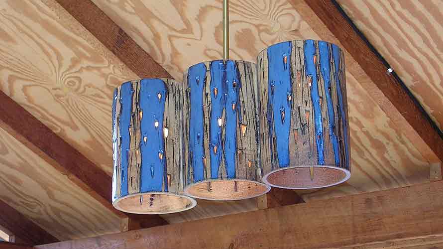 Hanging light designed for contemporary teahouse. It is lit in each tube. 18” s x 12” h